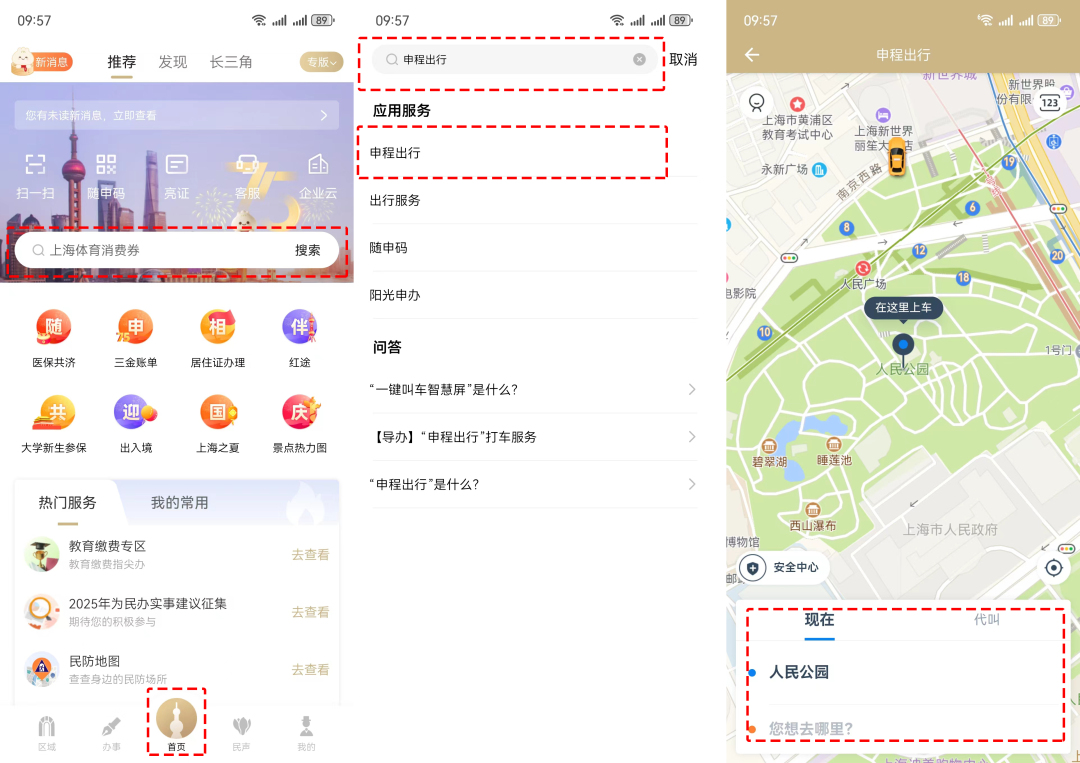1、登錄“隨申辦市民云”APP→首頁搜索框中輸入關(guān)鍵字“申程出行”→點擊進(jìn)入服務(wù)頁面;