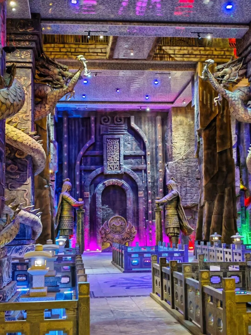 沿錦繡宮而下,與之相連的“龍宮”則更是瑰麗玄幻、氣勢(shì)恢宏?!帮w龍?jiān)谔臁?、“劍鳴龍泉”、“金蟾獻(xiàn)瑞”等10大景觀令現(xiàn)場(chǎng)游客嘆為觀止。