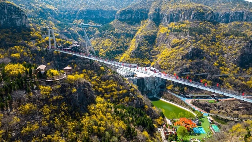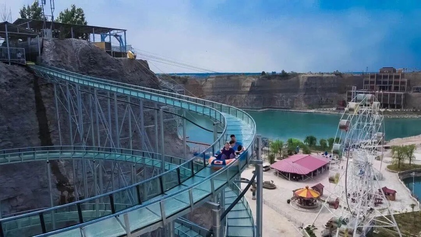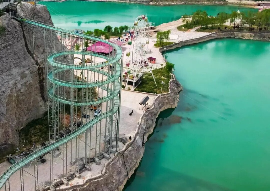 懸崖之間的玻璃棧橋和玻璃漂流是來(lái)這里必打卡的項(xiàng)目。玻璃棧橋橫跨崖壁,腳下是澄澈湖水,行走其上,如履薄冰卻又滿心歡喜;玻璃漂流全長(zhǎng)數(shù)千米,最高落差60米,穿行在崖壁之間,浪花飛濺,尖叫與歡笑交織,讓你感受現(xiàn)實(shí)版的速度與激情。