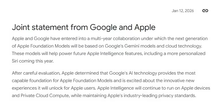 就在昨天,2026年1月12日,科技圈發(fā)生了一件足以載入史冊(cè)的大事:蘋果和谷歌,這兩家在硅谷斗了十幾年的死對(duì)頭,正式官宣“領(lǐng)證”了。