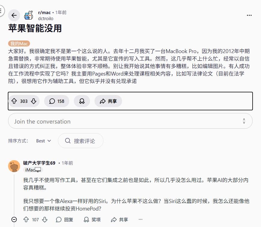 我看了一下,老外對(duì)Siri的不滿主要集中在準(zhǔn)確度差、功能有限,AIGC體驗(yàn)令人失望上,就像上面這種帖子,在國外貼吧Reddit里起碼有成百上千條,隨隨便便都能騙到三百多贊,你就知道有多少老外在共鳴了。