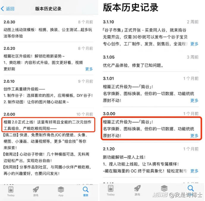 10個月前,橙篇2.0上線時,APP版本更新中就提到了“這里有好用且全能的二次元創(chuàng)作工具組合,產(chǎn)糧吃糧找同擔”。想來那時,文庫內(nèi)部對橙篇的定位就已經(jīng)發(fā)生了改變,并為搗谷的更名埋下了伏筆。