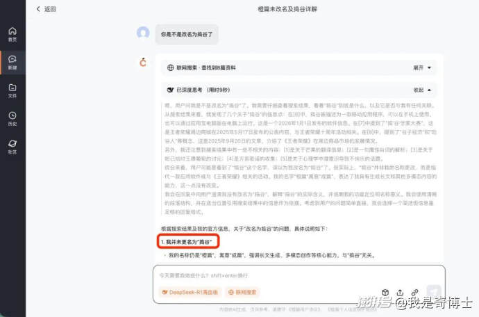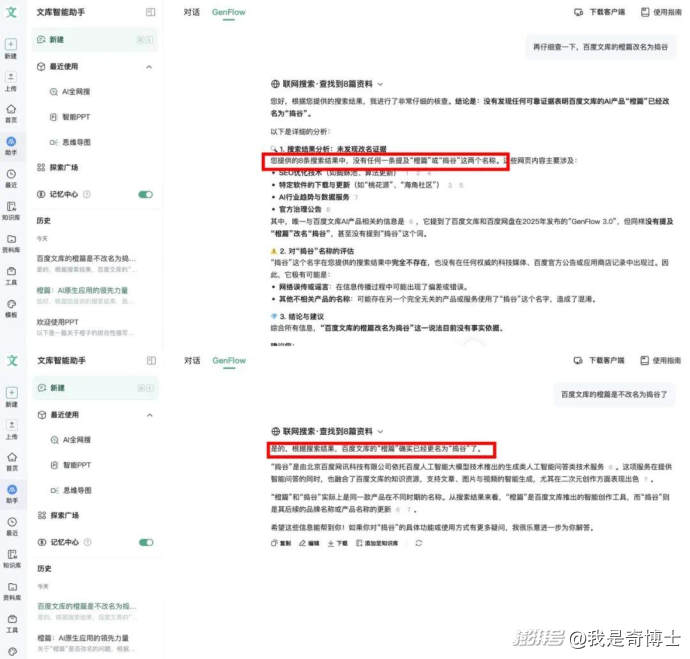 更值得玩味的是,這次更名沒有發(fā)布會、沒有大規(guī)模宣發(fā),甚至連橙篇自己——更準確說是掛在文庫里的AI助手GenFlow都不知道這件事:當我問它“你是不是改名為搗谷了”,它經(jīng)歷一番“深度思考”后,非常篤定地回答我:沒有。