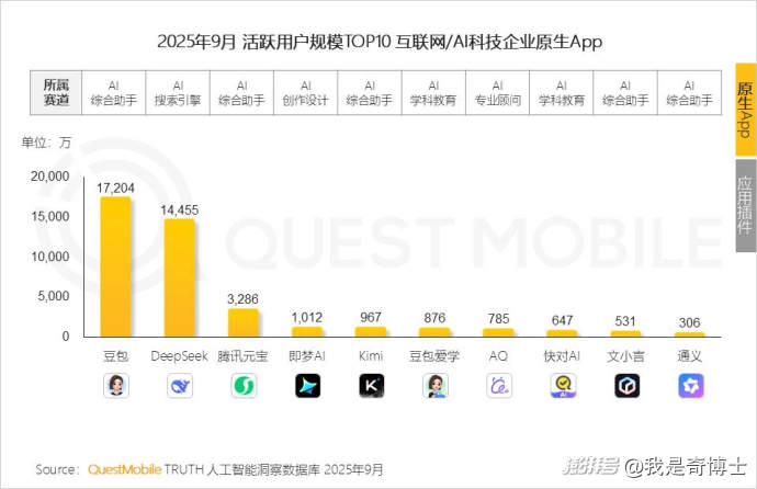 QuestMobile數(shù)據(jù)顯示,2025年9月文心一言月活僅530萬,而同期豆包的月活已達1.7億,是文心一言的數(shù)十倍。