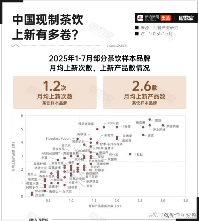 而在大后方,作為全球最大的茶飲消費市場,國內(nèi)新茶飲品牌展現(xiàn)出強勁的研發(fā)與運營實力。行業(yè)數(shù)據(jù)顯示,2025年1-7月主流品牌平均每月上新約1.2次、推出2.6款新品,形成穩(wěn)定的產(chǎn)品迭代節(jié)奏。