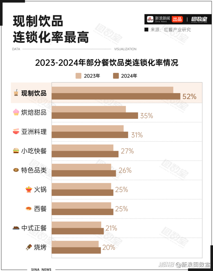 現(xiàn)制飲品成為餐飲業(yè)態(tài)中連鎖化率最高的品類。據(jù)紅餐產(chǎn)業(yè)研究,2024年,國內(nèi)現(xiàn)制飲品連鎖化率高達52%,把第二名的烘焙甜品(35%)甩出一大截。