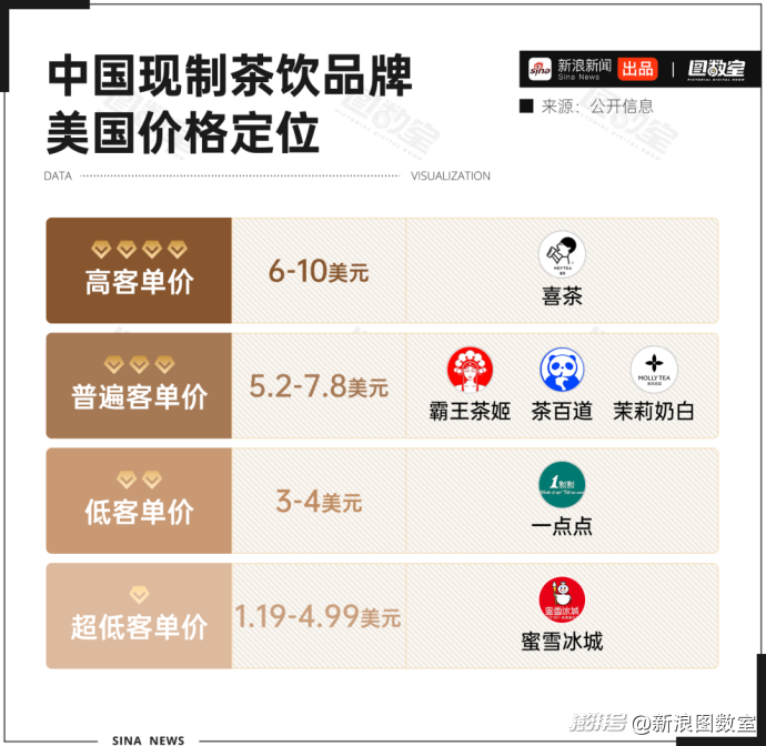 圖數(shù)室據(jù)公開信息整理發(fā)現(xiàn),當前出海的中國茶飲品牌,通過差異化的定價,形成了覆蓋高、中、低、超低四個層級市場的格局。