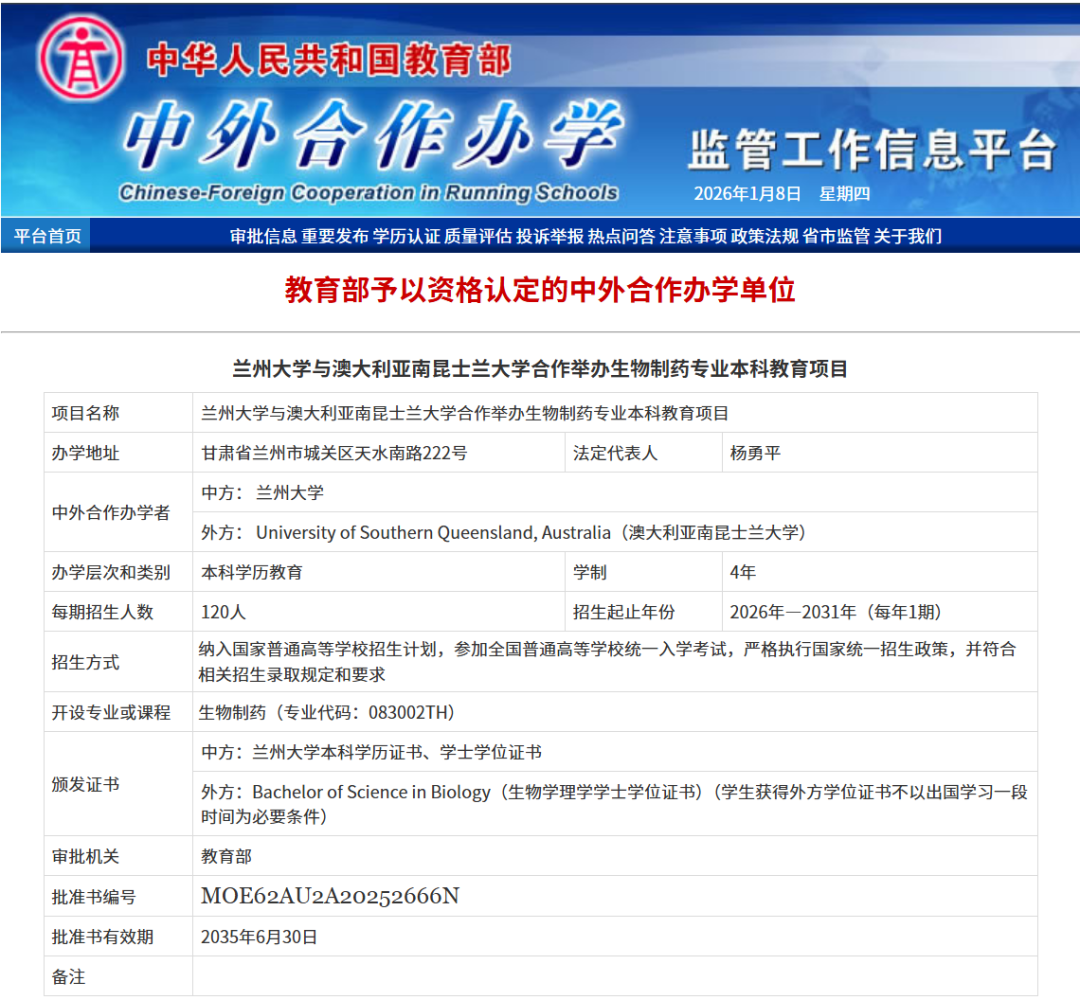 近日,教育部正式批準(zhǔn)蘭州大學(xué)與澳大利亞南昆士蘭大學(xué)合作舉辦生物制藥專業(yè)本科教育項(xiàng)目。該項(xiàng)目是蘭州大學(xué)在推進(jìn)教育對(duì)外開(kāi)放進(jìn)程中的一項(xiàng)重要突破,標(biāo)志著學(xué)校國(guó)際化辦學(xué)水平邁上新臺(tái)階。
