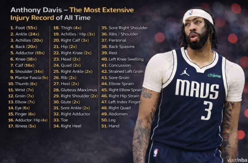 但最終,這些紙上談兵的方案沒有一個能夠成為現(xiàn)實(shí)的官宣,甚至連接近的程度都沒有達(dá)到。究其原因,媒體和球迷的持續(xù)“自嗨”也是因?yàn)榇骶S斯的傷病。據(jù)ESPN統(tǒng)計(jì),自從加盟獨(dú)行俠后,戴維斯已經(jīng)遭遇了腹部、眼部、大腿、手部韌帶等9種不同的傷病。另據(jù)美國媒體列出的一張傷病歷史圖,戴維斯在職業(yè)生涯里已經(jīng)遭遇了過51種傷病,其中發(fā)生次數(shù)最多的傷病為足部傷病,一共55次。
