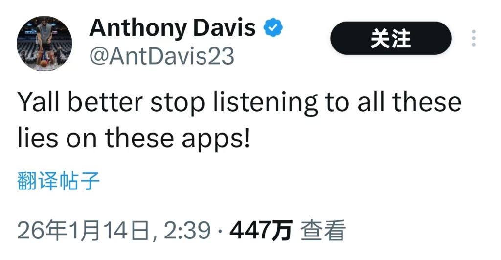 安東尼·戴維斯親自在線辟謠自己“即將手術(shù)”的消息,并且表示很多流言都是謊言。
