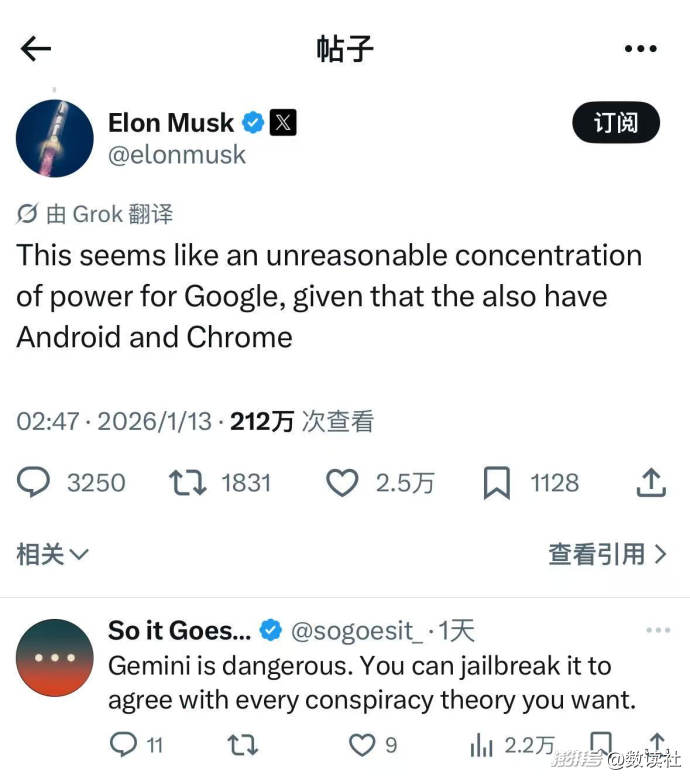 馬斯克在社交媒體上公開炮轟稱,“考慮到Google已經(jīng)擁有Android和Chrome,這似乎是一種不合理的權(quán)力集中?!泵餮廴硕寄芸吹剑R斯克覺得不合理,更多指向的是谷歌壟斷地位,雙方合作,谷歌才是更大的受益者。