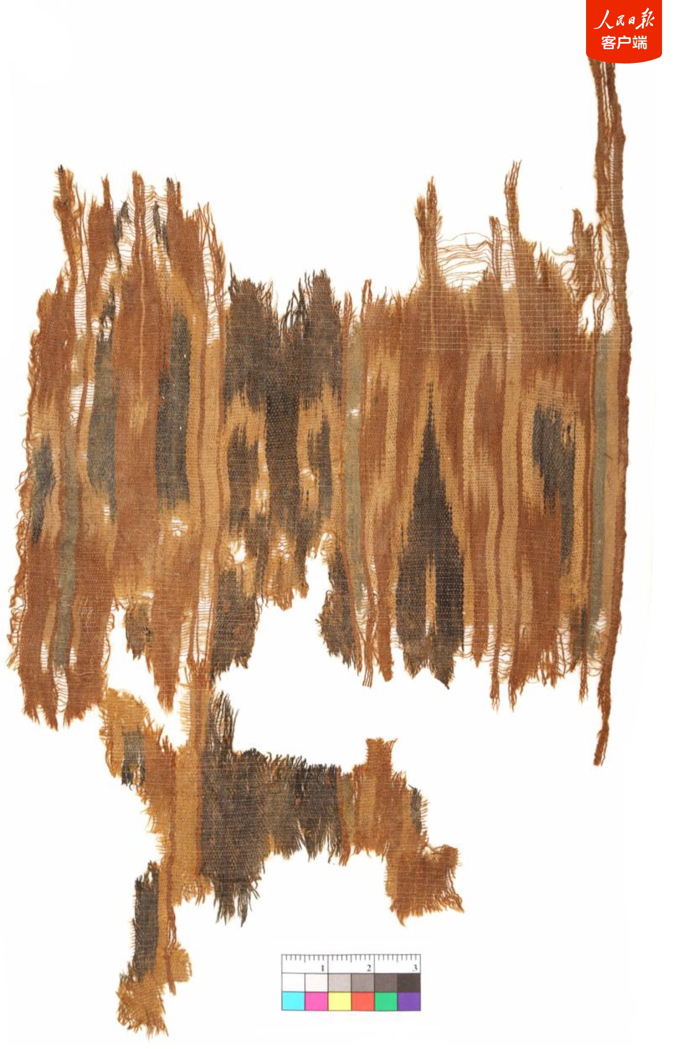 青海都蘭熱水墓群2018血渭一號墓出土扎經(jīng)染色織物實(shí)物圖。