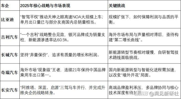 在自主品牌“五?!标嚑I(yíng)中,2025年呈現(xiàn)出迥異的戰(zhàn)略選擇和處境,下表梳理了其核心特點(diǎn):
