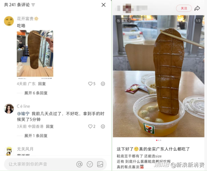 有網(wǎng)友跟風購買該款豆干“以身試鞋底”,表示“吃了,味道有點寡淡”。更多人則是觀望并表示驚訝“反正我下不去口”“萬一混進去個真的咋辦?”;還有網(wǎng)友調(diào)侃稱“這下可坐實了‘廣東人什么都吃’的傳言”。