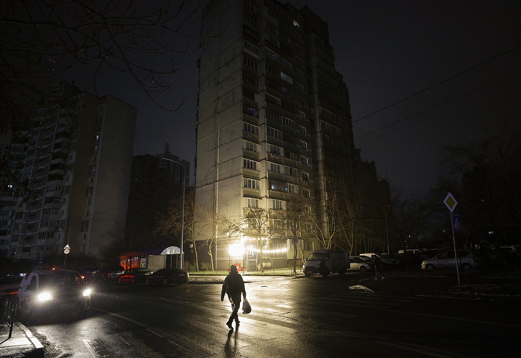 當?shù)貢r間2025年12月27日,烏克蘭基輔,俄烏沖突持續(xù),當?shù)卦庥鐾k?,人們走在黑暗的街道上。視覺中國 資料圖
