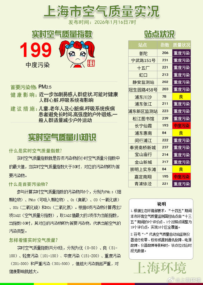 據(jù)“上海環(huán)境”微博消息,1月16日7時上海市實時空氣質量指數(shù)為199,中度污染,首要污染物為PM?.?,兒童、老年人及心臟病、呼吸系統(tǒng)疾病患者避免長時間、高強度的戶外鍛煉,一般人群適量減少戶外運動。