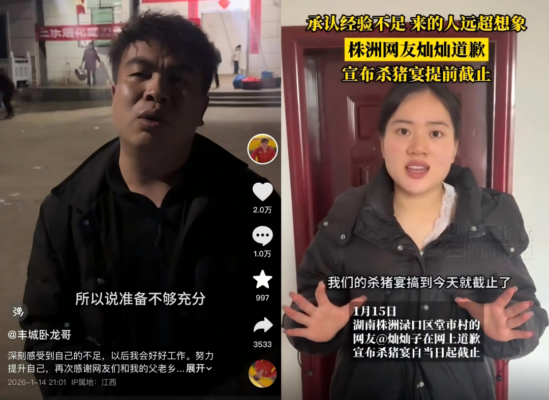 而在湖南株洲,最早跟風呆呆搞殺豬宴的燦燦也在15日宣布殺豬宴提前結束。