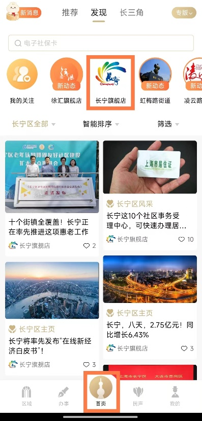 進(jìn)入首頁(yè)后建議點(diǎn)擊右上角的“加關(guān)注”可隨時(shí)關(guān)注長(zhǎng)寧區(qū)動(dòng)態(tài)詳情,并且日后可在首頁(yè)的“發(fā)現(xiàn)”頻道“我的關(guān)注”板塊中找到,點(diǎn)擊圖標(biāo)或“進(jìn)主頁(yè)”即可快速進(jìn)入旗艦店首頁(yè)。