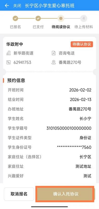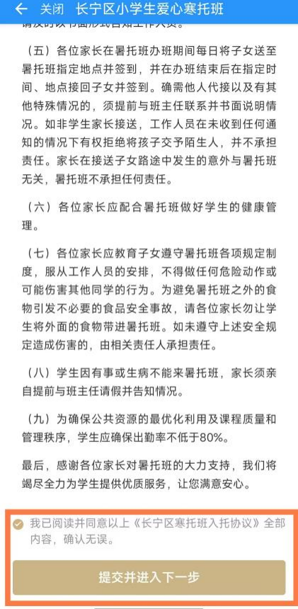 線上報(bào)名支付后,需在系統(tǒng)內(nèi)仔細(xì)閱讀并勾選確認(rèn)《上海市小學(xué)生愛(ài)心寒托班入托協(xié)議書》完成線上報(bào)名。開(kāi)班第一天請(qǐng)家長(zhǎng)至辦班點(diǎn)現(xiàn)場(chǎng)簽署紙質(zhì)版協(xié)議。家長(zhǎng)應(yīng)于開(kāi)班前3天確認(rèn)孩子健康狀況,如有身體不適,請(qǐng)及時(shí)告知并暫緩入托。