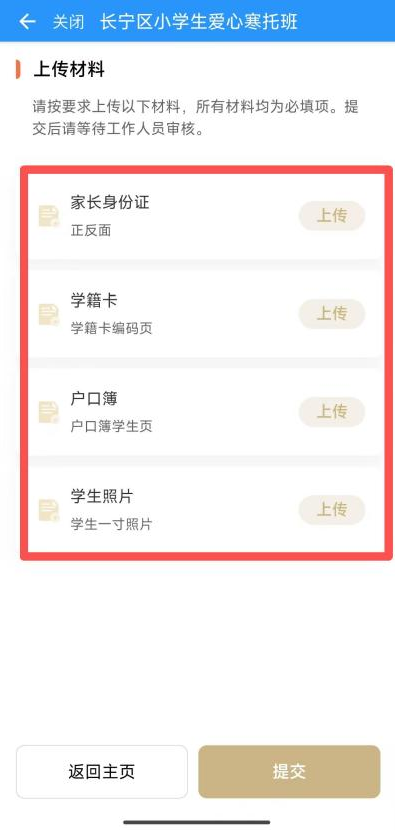 進(jìn)入材料上傳階段,請(qǐng)根據(jù)頁(yè)面提示,按要求在規(guī)定位置上傳入托所必要的相關(guān)材料,全部上傳完成后請(qǐng)點(diǎn)擊“提交”,等待工作人員審核。