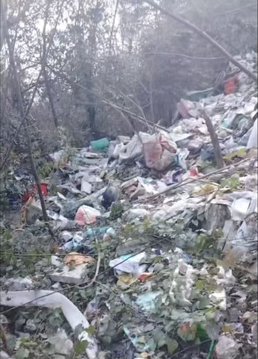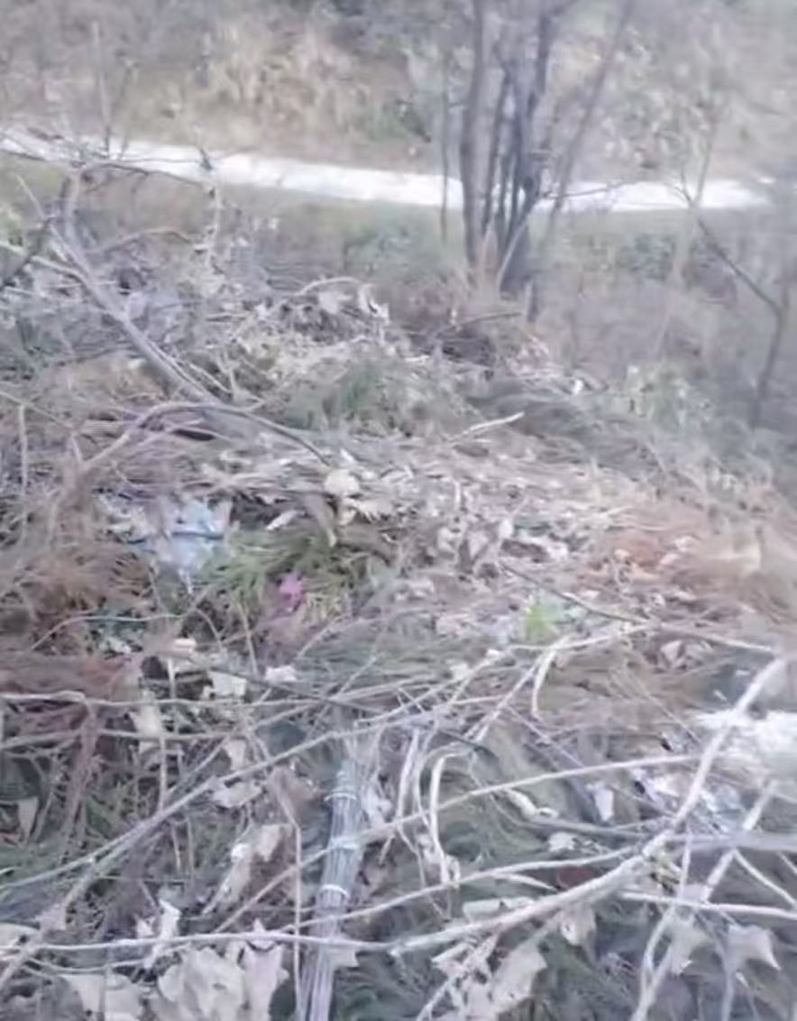 視頻顯示,在蜿蜒的山間小路旁,堆積著大量生活垃圾,其中還混雜著醫(yī)療廢物,且垃圾堆上方被覆蓋了一層樹枝。有網(wǎng)友質(zhì)疑這種 “遮丑式”做法是掩耳盜鈴。