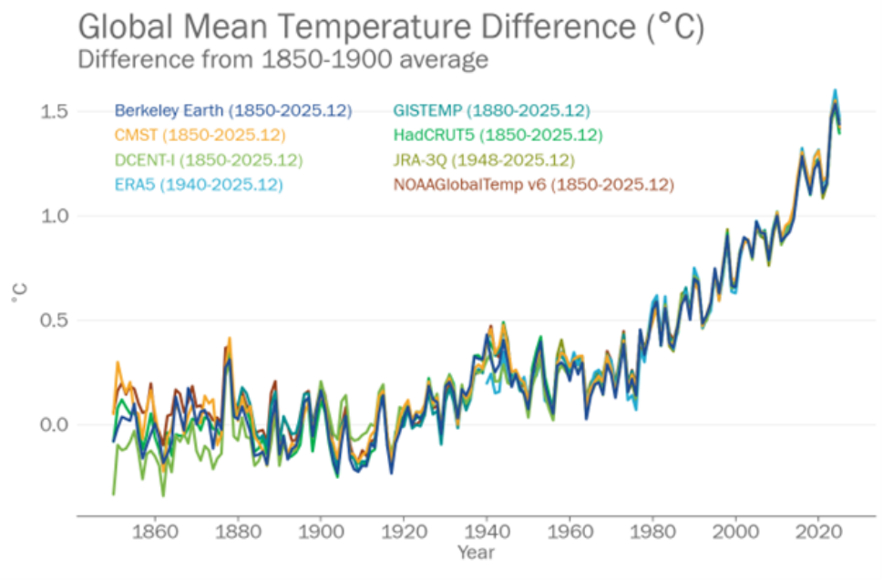 過(guò)去三年(2023年至2025年)在所有八個(gè)數(shù)據(jù)集中都是最熱的三年。整合后的2023年至2025三年平均氣溫比工業(yè)化前時(shí)期高出1.48°C(不確定性范圍為±0.13°C)。過(guò)去十一年(2015年至2025年)在所有八個(gè)數(shù)據(jù)集中都是最熱的十一年。