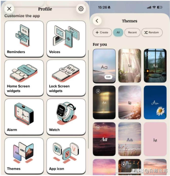 而除此之外,單詞卡的背景、App 的 Icon,甚至用智能手表背單詞都可以由用戶自主設(shè)置。就拿單詞卡背景來(lái)說(shuō),用戶可以在系統(tǒng)提供的背景中進(jìn)行選擇,還可以自己上傳圖片制作背景,而且部分背景還有類似 ASMR 的音效,輔助用戶集中注意力。
