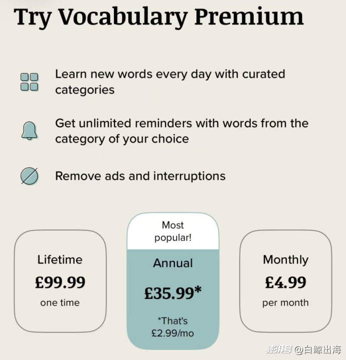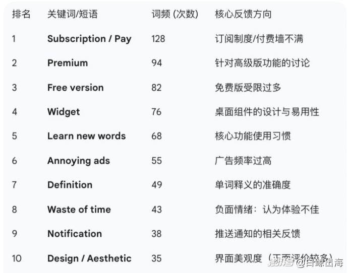 從用戶評(píng)論來(lái)看,絕大多數(shù)對(duì) Vocabulary 的好評(píng)都集中在功能層面,包括單詞卡提供釋義和讀音,以及小組件和通知的設(shè)計(jì)。而差評(píng)主要集中在收費(fèi)高以及付費(fèi)墻的設(shè)計(jì)方面。