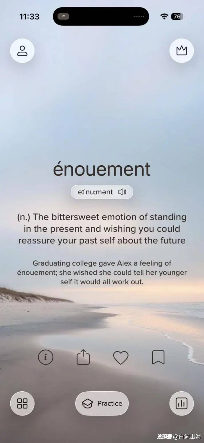 而進(jìn)入 Vocabulary,主頁(yè)就是“單詞卡片”(如上圖),卡片上會(huì)顯示單詞、音標(biāo)、讀音、英英釋義和例句,但并沒(méi)有其他語(yǔ)言的釋義,用戶可以像刷短視頻一樣上下劃動(dòng)來(lái)學(xué)習(xí)單詞。單一界面下,用戶聚焦 1 個(gè)單詞,整個(gè)畫(huà)面中并沒(méi)有其他元素分散用戶的注意力。仔細(xì)看這個(gè)畫(huà)面,基本就是把我們小時(shí)候?qū)W英語(yǔ)用的詞典頁(yè)面重構(gòu)下,配個(gè)背景圖展示給用戶 ....