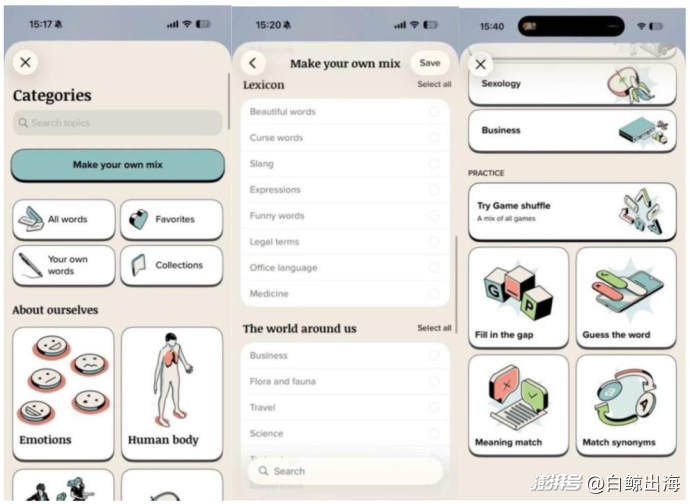 體驗(yàn)下來(lái),Vocabulary 采用了一種 " 主題驅(qū)動(dòng) + 用戶主動(dòng)選擇 + 系統(tǒng)擴(kuò)散 " 的設(shè)計(jì)。