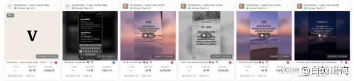 增長(zhǎng)層面,團(tuán)隊(duì)基本上就是我們剛才說(shuō)單詞頁(yè)面+好看的背景+舒緩音樂(lè)展示給用戶,并在配文當(dāng)中突出“Everyday”和“Expend Vocabulary”,整體透露出每天愜意著就完成了提升,寧?kù)o以致遠(yuǎn)的感覺(jué),不得不說(shuō),用戶很吃這一套,這類素材的展示量不低,平均 20 萬(wàn)+。