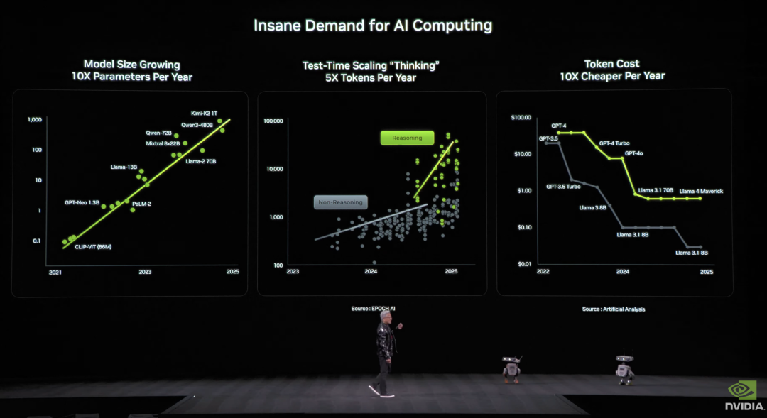 在演講中,黃仁勛與機(jī)器人一同登臺(tái),直觀展示了這一趨勢(shì)的加速到來。