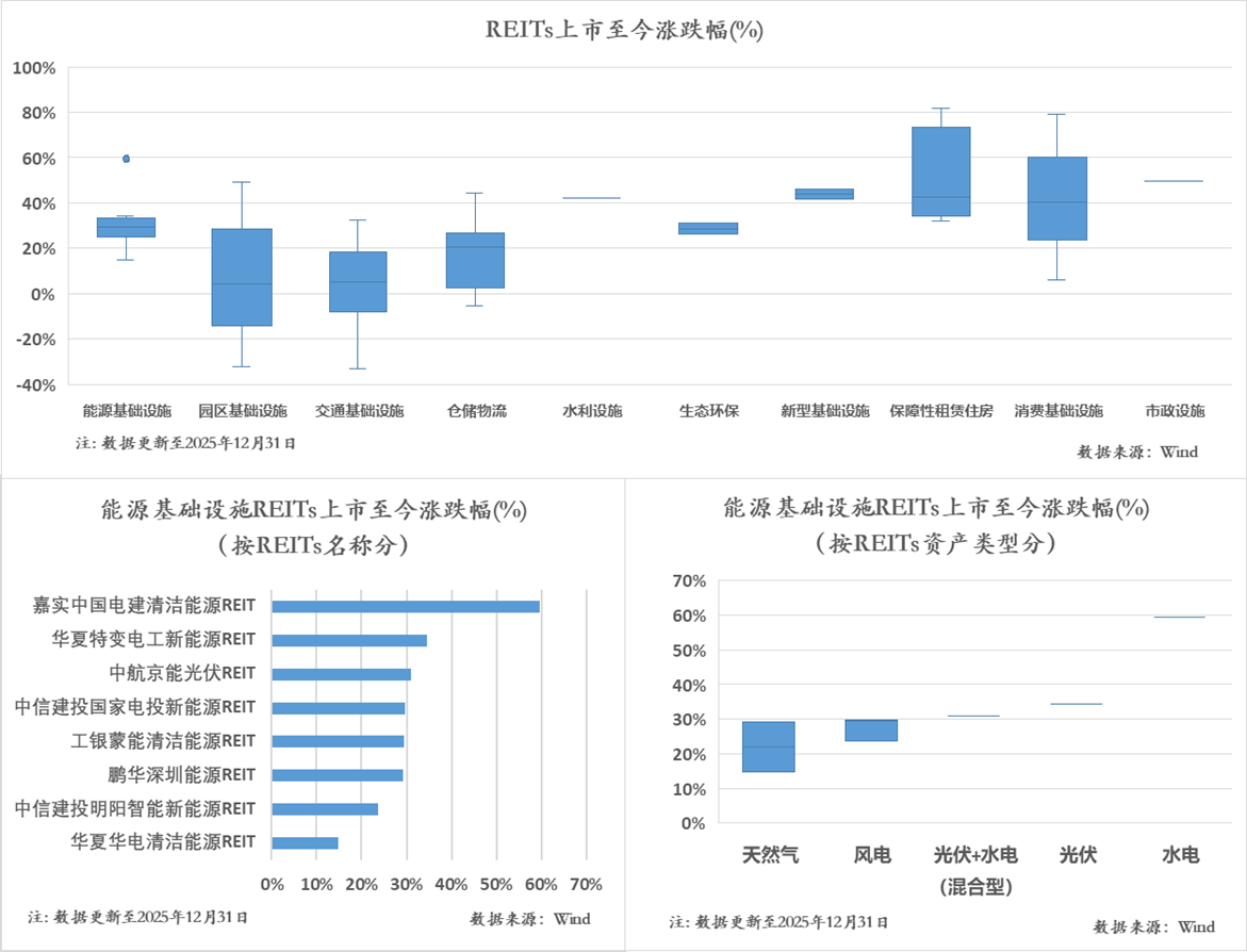 萬得數(shù)據(jù)顯示,截至2025年12月31日,已上市的8只能源基礎(chǔ)設(shè)施REITs自上市以來漲幅中位數(shù)達到30%,且漲幅區(qū)間分布集中。其中,新能源REITs(風(fēng)電、光伏)最高漲幅達到60%,主要集中區(qū)間為25%—35%,整體表現(xiàn)優(yōu)于REITs板塊平均水平,反映出市場對新能源REITs的認可。