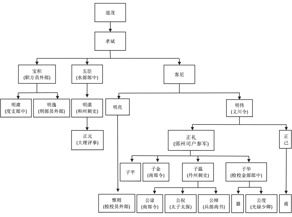 曾祖道茂,周奉朝請、本州主簿、東道行臺郎中、洛州長史、南陽汝北向城三郡守、除驃騎將軍、贈車騎大將軍、儀同三司、勛介二州刾史。……祖孝斌,周宣納上士、隋淮南霍丘縣令?!缚湍?,隋左衛(wèi)兵曹參軍、唐同州澄城縣令、鄜州別駕。