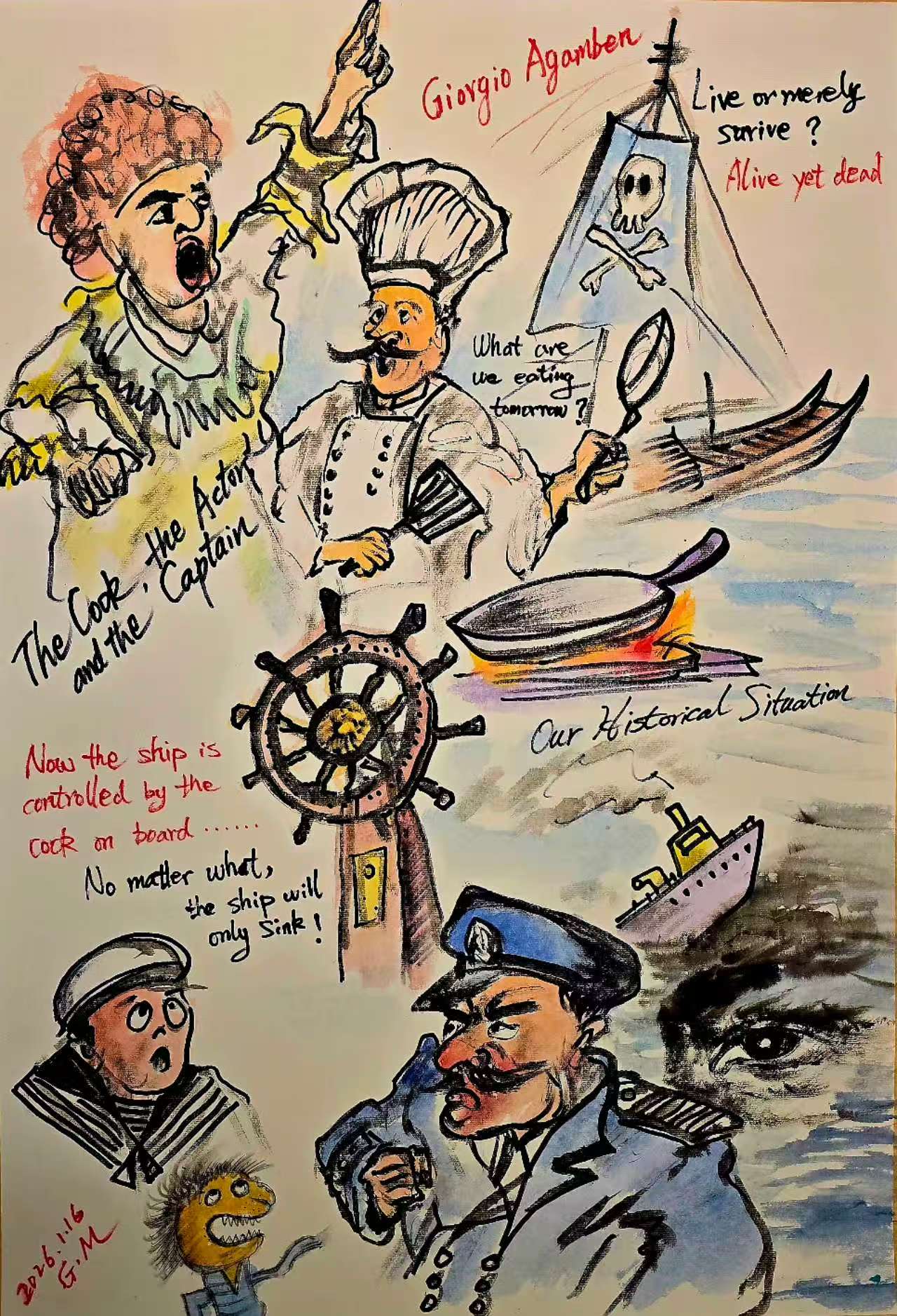 圖2 阿甘本論廚子、戲子和船長(zhǎng) 紙本彩墨 65cm X 45cm 李公明 作 2026年1月16日