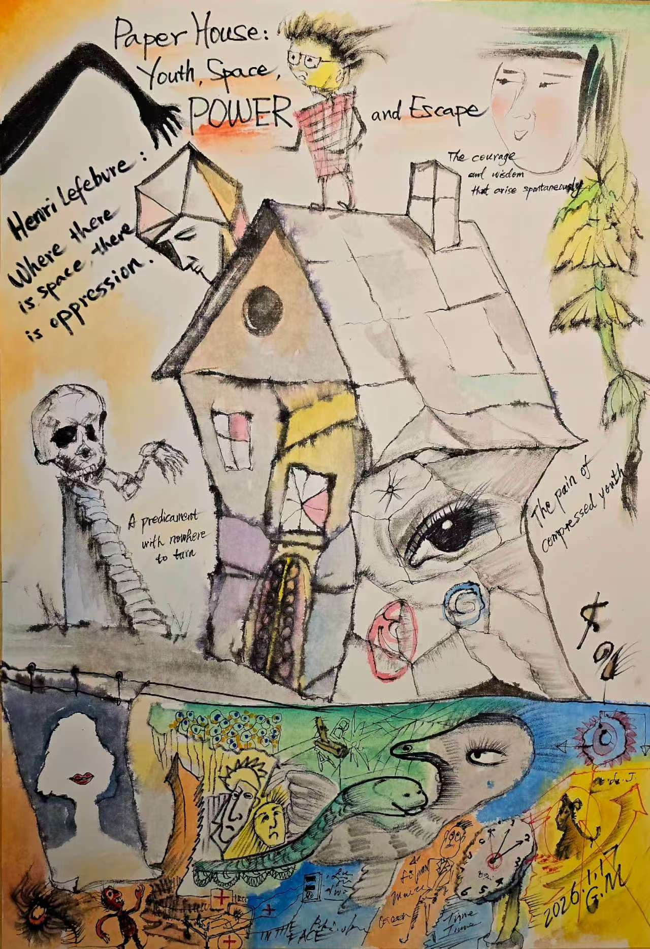 圖3 《紙房子》中的青春與空間、權(quán)力和逃離 紙本彩墨 65cm X 45cm 李公明 作 2026年1月17日