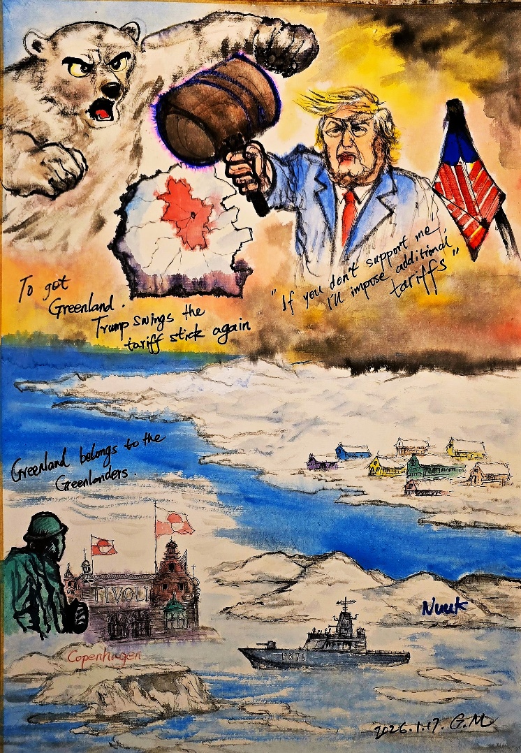 圖1 為了得到格陵蘭島,特朗普再揮關(guān)稅大棒:“不支持我的話就加征關(guān)稅” 紙本彩墨 65cm X 45cm 李公明 作 2026年1月17日