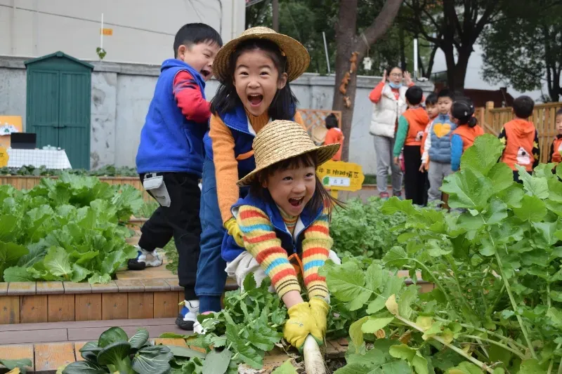 上海徐匯區(qū)果果幼兒園的孩子們在農(nóng)莊里采摘蘿卜。