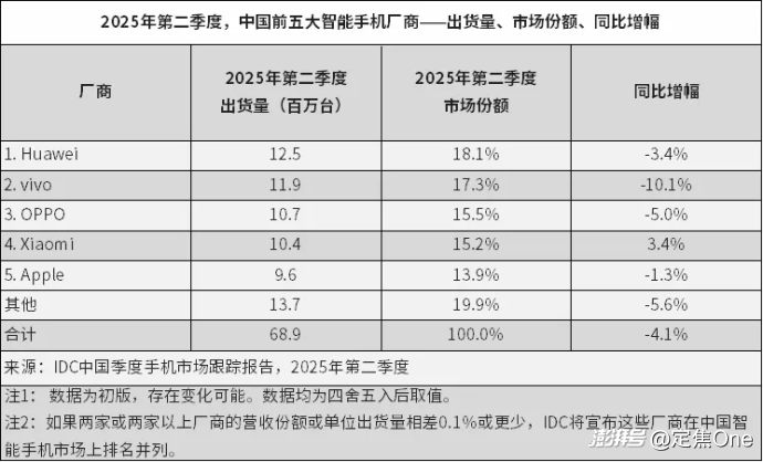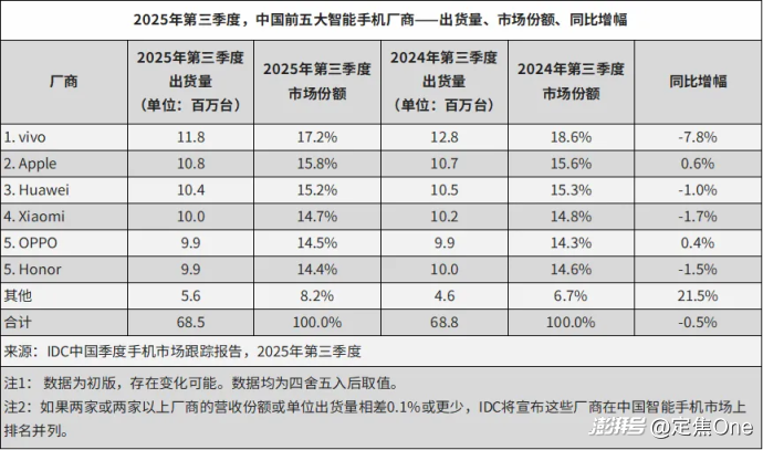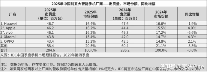 IDC的數(shù)據(jù)最能說明問題:2025年,vivo全年出貨量同比跌了6.6%,是前五名里跌得最狠的;小米雖然全年微增4.3%,但第四季度直接暴跌18%,比華為跌幅還大;OPPO全年微增2.1%,變化不大。