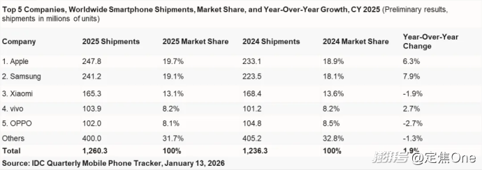 整體復盤2025年,蘋果、三星、華為的地位更加穩(wěn)固,小米、vivo、OPPO的份額則在被擠壓,分化加劇。