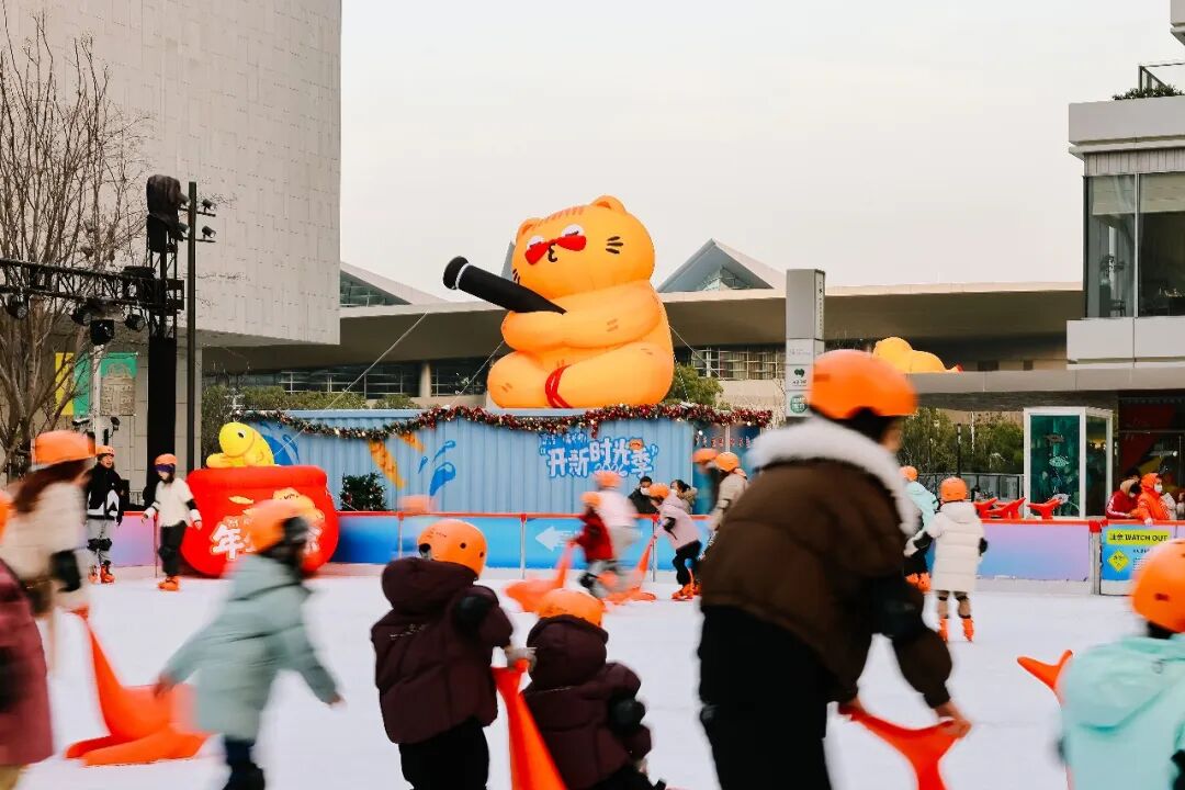 冰場一角,巨型“橘噗噗”氣膜悠然執(zhí)竿,垂釣著一口寓意“年年有余”的吉祥缸。隨著花木時光里“開新時光季”啟幕,這只對世界充滿好奇的“大橘貓”,以其善良、率真、元氣滿滿的形象,融入多處沉浸式打卡點,構(gòu)筑起一個集藝術(shù)美陳、冰上運動與親子互動于一體的體驗空間,陪伴市民度過冬日時光。