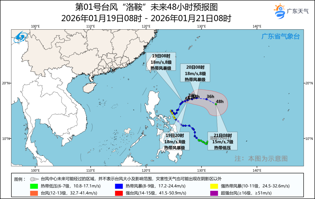 臺風(fēng)動態(tài):海上還有一個對廣東海陸無直接影響的第1號臺風(fēng)“洛鞍”(熱帶風(fēng)暴級),19日08時,其中心位于菲律賓馬尼拉東偏北方向約640公里的洋面上,也就是北緯16.6度、東經(jīng)126.6度,中心附近最大風(fēng)力8級(18米/秒),中心最低氣壓為998百帕。 預(yù)計,“洛鞍”將以每小時10公里左右的速度向偏東方向移動,強度逐漸減弱。