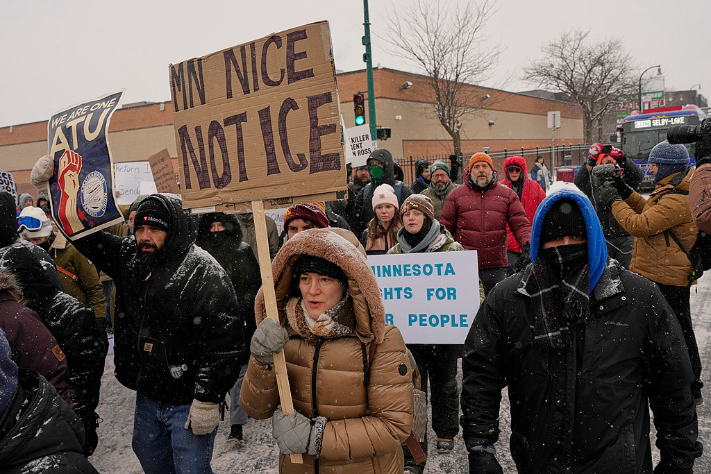 當(dāng)?shù)貢r(shí)間2026年1月18日,美國明尼阿波利斯,抗議者舉行示威活動(dòng),反對(duì)美國移民和海關(guān)執(zhí)法局(ICE)。
