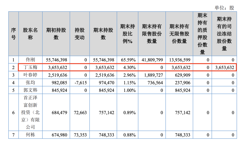 公司2025年半年報(bào)披露的股東名單顯示,在普通股前十名股東中,僅有一位名為丁玉梅的第二大股東所持有的全部3653632股股份被司法凍結(jié),持股比例為4.3%。經(jīng)澎湃新聞從知情人士處確認(rèn),該自然人股東丁玉梅為恒大集團(tuán)創(chuàng)始人許家印的前妻。
