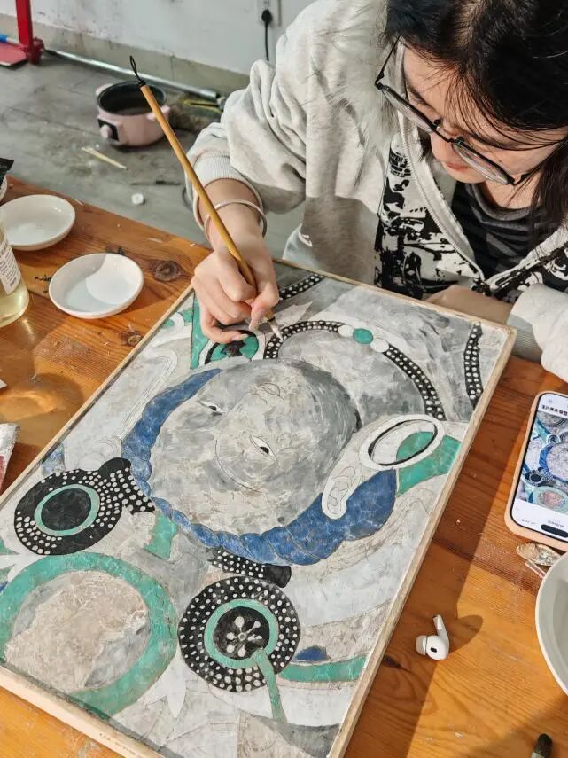 古壁畫摹寫課,是與歷史的沉浸式對話。調(diào)和礦物顏料、勾勒古樸線條時,既體會到古人的匠心與技法智慧,也讀懂了壁畫殘痕里的文化密碼。課程讓我沉下心感知傳統(tǒng),不止是技法的習(xí)得,更是一場與歷史的深情相擁。那些凝結(jié)在礦物顏料里的千年時光,那些藏在頓挫線條里的匠心風(fēng)骨,終究會在一代又一代的指尖流轉(zhuǎn),生生不息。