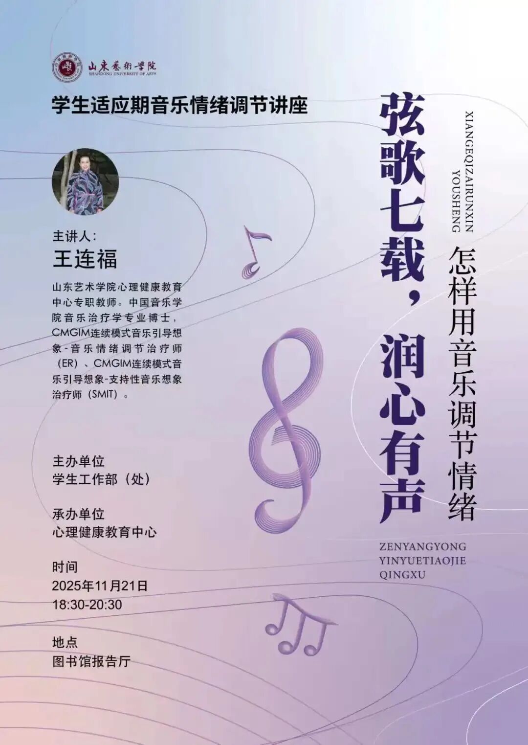 作為學(xué)校心理健康教育普及與預(yù)防體系建設(shè)的重要一環(huán),山東藝術(shù)學(xué)院心理健康教育中心近期面向2025級(jí)全體學(xué)生開(kāi)展了“弦歌七載,潤(rùn)心有聲——音樂(lè)情緒調(diào)節(jié)專題講座”。音樂(lè)治療主題講座自2019年首次推出以來(lái),已連續(xù)舉辦七年,形成覆蓋全體新生、注重音樂(lè)治療相關(guān)減壓方法的傳遞、突出普及預(yù)防的心理健康教育品牌項(xiàng)目。