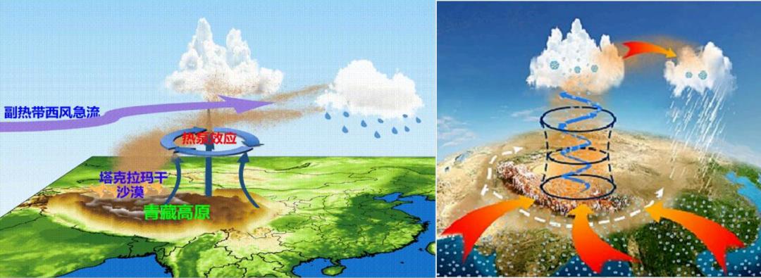 可以說,氣溶膠“轉(zhuǎn)運(yùn)”背后的動(dòng)力密碼是:在印度夏季風(fēng)與高原“熱泵效應(yīng)”的接力協(xié)同下,來(lái)自中東、非洲、南亞等地的粉塵被“抽吸”至對(duì)流層頂,甚至進(jìn)入平流層。這些粉塵一旦“登頂”,便隨大氣環(huán)流進(jìn)行全球擴(kuò)散。