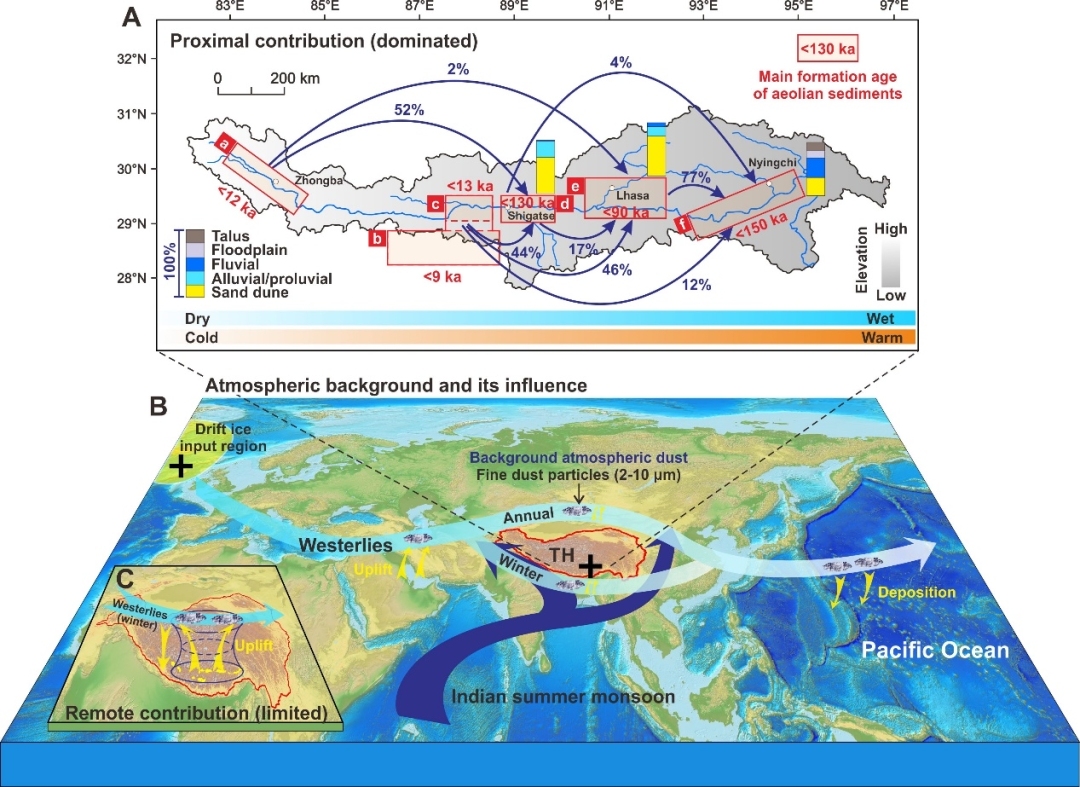 “過去6年間,我們團(tuán)隊(duì)踏遍雅江流域開展野外調(diào)查,首次繪就了風(fēng)成沉積物的空間分布圖,發(fā)現(xiàn)這些地表粉塵主要來(lái)自流域內(nèi)部,大多堆積于距今一萬(wàn)年以來(lái)。更關(guān)鍵的是,我們破解了地表粉塵的‘氣候密碼’:西風(fēng)與季風(fēng)攜手調(diào)控了濕度變化,而冷季太陽(yáng)輻射和冰量控制的高原冷季溫度決定了粉塵活動(dòng)的強(qiáng)弱。這些粉塵不僅深刻影響雅江流域的生態(tài)環(huán)境,還能搭乘‘西風(fēng)快車’,一路飄向下風(fēng)向地區(qū),對(duì)沿途海陸生態(tài)系統(tǒng)產(chǎn)生連鎖影響?!眻F(tuán)隊(duì)骨干楊軍懷博士后說。
