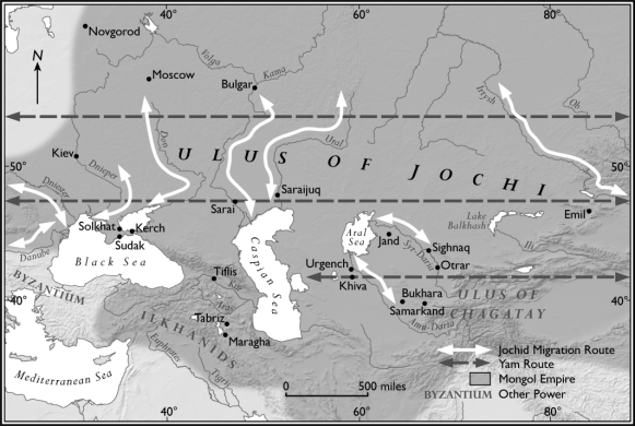 “金帳汗國”這一名稱在不同語言中有不同稱呼,同時其所涵蓋的政治實體并非單一家族領(lǐng)地,而是蒙古帝國諸分支中的一個重要組成部分。在突厥語語境中,“金帳”不僅隱喻著政治權(quán)力,也涉及人與人、人與土地之間的關(guān)系,因而也具有“國家”的概念。而當(dāng)我們將金帳汗國的疆域投影于地圖上后,就可以清楚地看出它既是蒙古帝國的一部分,又擁有自身的結(jié)構(gòu)與邏輯。這同時體現(xiàn)在幾組地理概念中:如汗國的政治中心薩萊(Sarai)和當(dāng)時勢力尚弱的莫斯科的對應(yīng)。而地圖也直觀地顯示出交通路線對金帳汗國政治走向的決定意義——在缺乏直接進(jìn)入地中海通道的背景下,汗國必須通過外交和商貿(mào)網(wǎng)絡(luò)與活動于黑海地區(qū)的商人建立聯(lián)系。