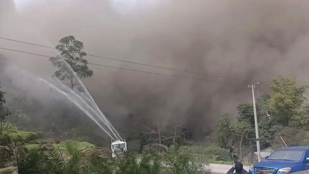 村民發(fā)布的視頻畫面顯示,天空被采石場(chǎng)爆破揚(yáng)起的灰塵盡數(shù)籠罩,現(xiàn)場(chǎng)一輛灑水降塵車正持續(xù)向空中噴水作業(yè),試圖壓制揚(yáng)塵,卻很快也被漫天粉塵吞沒。據(jù)拍攝者介紹,這段視頻拍攝于1月14日,地點(diǎn)在自家門口,“這家采石場(chǎng)已經(jīng)經(jīng)營(yíng)多年,每次爆破都會(huì)產(chǎn)生大量灰塵,環(huán)境污染問題十分突出,此前已多次投訴反映”。